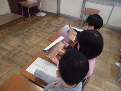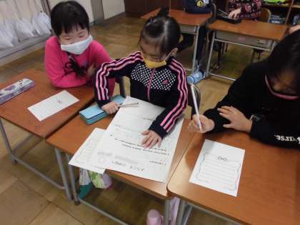 生活科の学習では、来年度入学予定の年長児に贈る月岡小学校についてのポスターを作成しています。小学校での学習や生活についての写真を貼り、メッセージを付けます。新1年生が「小学校に早く行きたいな」と思えるように、心を込めてメッセージを書いた子供たちです。