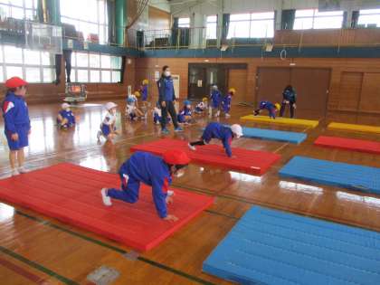 前半は、クマあるきやカエルとびなどで少しずつ体を慣らしました。後半は、ゆりかごから後転練習をおこないました。後転では、ひざをつかずに着地できるようになるなど達成感を感じながら取り組むことができました。