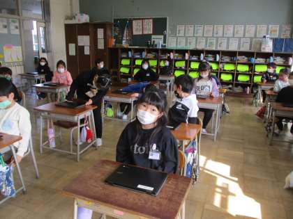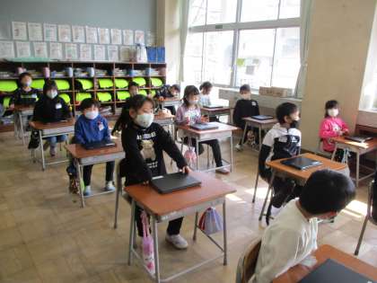 これから学習で使っていくクロムブックの使い方や約束について学習しました。その後、実際に自分のパソコンを持って、落とさないように気をつけて自分の席まで運びました。少しずつパソコンの使い方を練習していきます。