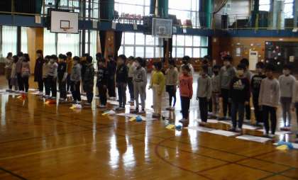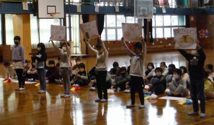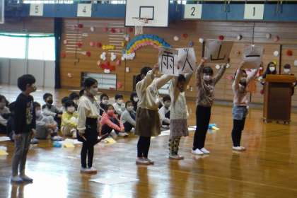 6年生に感謝の気持ちを伝える集会がありました。3年生からは、クイズと言葉の贈り物をしました。