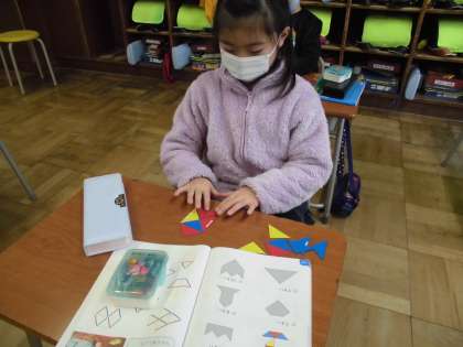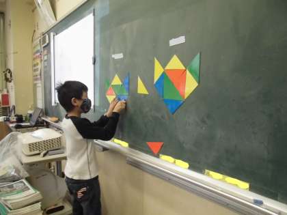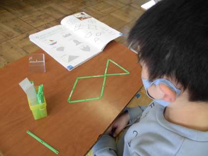 教科書にある形をまねて作ってみたり、自分で考えた形を作ったりしました。「三角が5つあるよ」、「見て!リボン作ったよ」と楽しく学習が進みました。