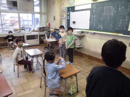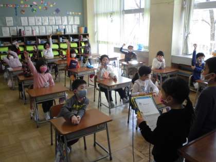 国語科「これは、なんでしょう」の学習では、ペアで相談して問題を考える活動をしました。ヒントをどの順番で言うかを決め、問題を出しました。子供たちは、ヒントについて質問をしたり、ヒントから想像したものを元気よく答えたりしていました。
