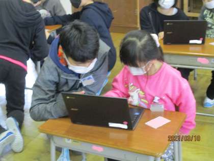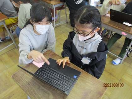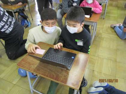 6年生「1年生に教えるよ!」 公開日 2021/03/10 更新日 2021/03/10 第6学年 今日は、6年生が1年生にパソコンの使い方を教えに行きました。パソコンの立ち上げ方やシャットダウンの仕方、パスワードの入力やクラスルームへの入り方など、6年生の子供たちは、一つ一つ確認しながら、優しく教えることができました。1年生に「ありがとう」とお礼を言われて、6年生もとてもうれしそうでした。