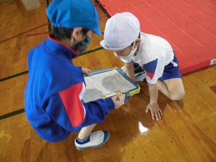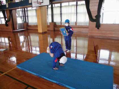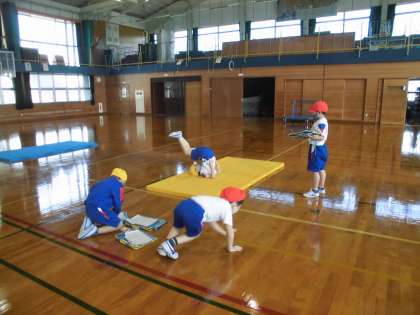 練習を繰り返して、できる技を増やしてきました。「オッケーだよ」、「次、これにしよう」と友達と声をかけ合いながら進め、できた技にサインをあげていました。