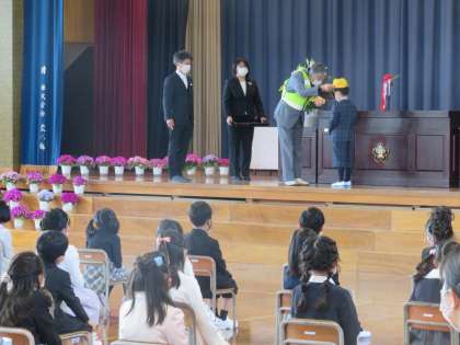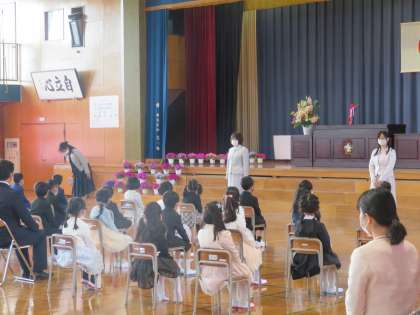 42名の新1年生が、月岡っ子の仲間入りをしました。1年生の子供たちは、校長先生や担任の先生方の呼びかけに「はい」と元気よく返事をしたり、お行儀よく座ってお話を聞いたり、小学生になった喜びとやる気がたくさん感じられる立派な姿でした。