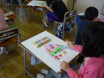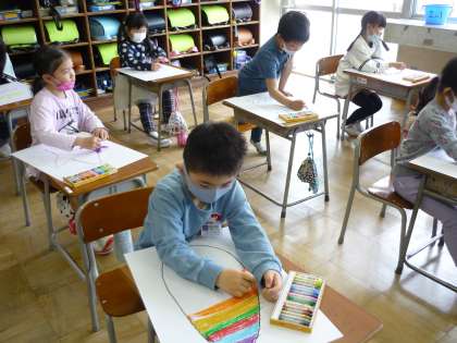 図画工作の時間では、「ふしぎなたまご」を描きました。世界に一つだけの「たまご」です。子供たちは思い思いに自分の「たまご」を描きました。