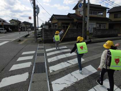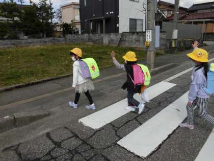 1年生 はじめてのことにチャレンジ2 公開日 2021/04/16 更新日 2021/04/16 第1学年 1年生で学年集団下校をしています。横断歩道では、「右・左・右」を確認し、手を挙げて渡っています。