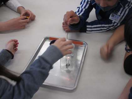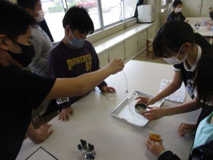 4月20日(火)6年生 物が燃え続けるためには・・・ 公開日 2021/04/20 更新日 2021/04/20 第6学年 理科で「物の燃え方と空気」の学習をしています。初めてマッチを使った子もいましたが、みんな安全に火をつけることができました。 でも、集気びんに入れたろうそくの火はしばらくすると消えてしまいました。子供たちは、どうしたらろうそくの火を燃え続けさせられるのかを真剣に考えていました。