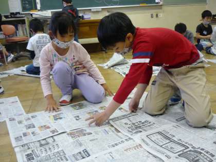 図画工作の時間、新聞紙をねじったりつなげたりして作る活動をしました。