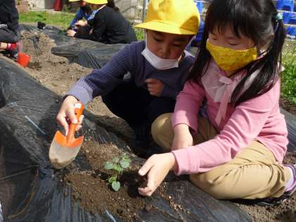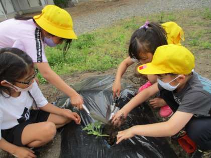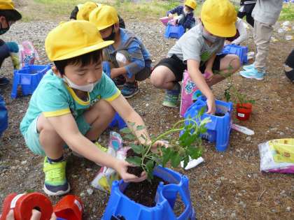 キュウリ、オクラ、ナス、スイカ、ピーマン、トマトの中から好きな野菜を選んで植えました。ミニトマトは一人一人の鉢で育てます。