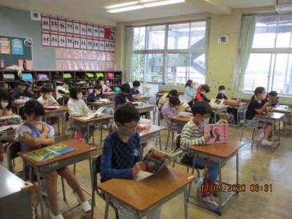 今日は、お話みっけ!の会の皆さんによる読み聞かせ2組の日でした。どの学年の子供たちも読み聞かせに聞き入り、物語の世界に浸っている様子でした。隣の1組では、一人一人が読書をしています。