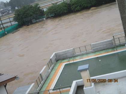 今週土曜日は運動会を予定していますが、心配されるのが天気です。最新の予報では、降水確率が50パーセントとなっています。また、前日金曜日は全日雨の予報となっており、グラウンドコンディションも心配されます。写真は、昨日からの雨で一面湖のようになったグラウンドです。