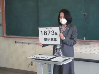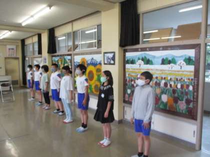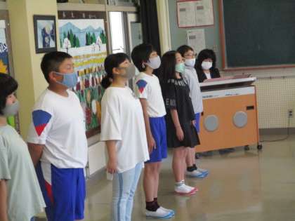 式では、校長先生から「148歳になった月岡小学校をこれからも一人一人が大事にしていきましょう」とお話がありました。そして、6年生代表児童による校歌斉唱を行いました。教室では、6年生の歌声を聞きながら、心の中で校歌を歌い、学校へのお祝いとしました。