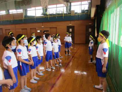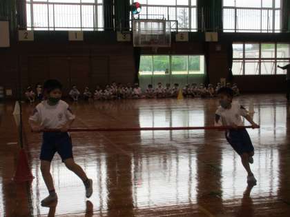 今日は、4年生と一緒にビッグタイフーンとかけ声の練習をしました。前回よりも速く走ることができるように、ペアや団で協力しながらがんばる姿がたくさん見られました。