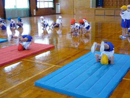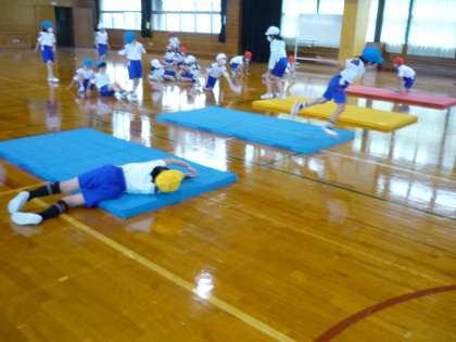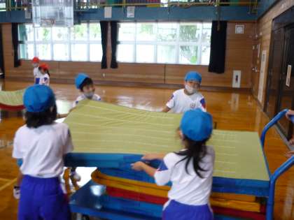 体育でマット運動をしました。1年生のときに学習した「丸太」や「ゆりかご」、「くま歩き」等でウォーミングアップをし、前転、後転を行いました。久々のマット運動でしたが、マットの準備、後始末もしっかりとできました。