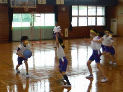 体育科の時間には、バスケット型ゲームに取り組んでいます。ドリブルはしないというルールに決めたので、ボールを持っている人よりも、持っていない人たちが、積極的にボールをもらえる場所に走っていきました。相手のパスコースをよんで、パスカットにトライしていました。これから、チームで練習方法を工夫していきたいと思います。