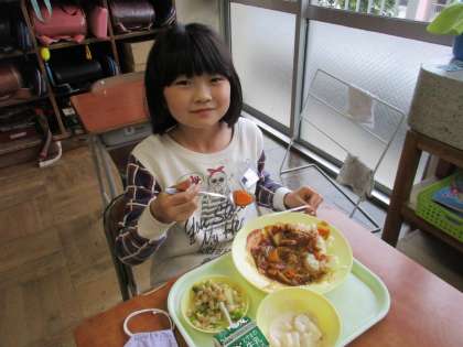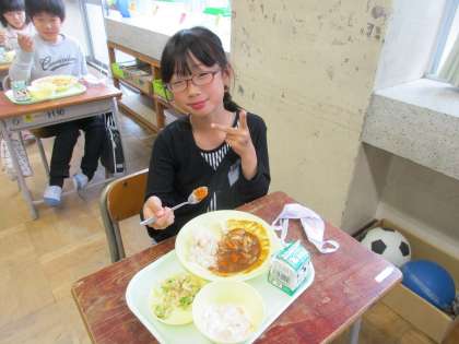 給食でたべキリンハヤシが出ました。たべキリンハヤシの中には、ハートのにんじんが隠れていました!見つけた子供たちは、うれしそうに食べていました。