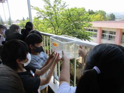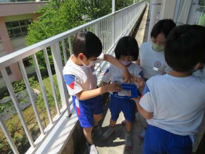 3年生「モンシロチョウになったよ!」 公開日 2021/05/28 更新日 2021/05/28 第3学年 理科で「チョウを育てよう」の学習をしています。これまで、幼虫やさなぎの様子を観察してきましたが、この数日で成虫になりました。子供たちと相談し、モンシロチョウを外に放すことにしました。子供たちは、広い空に飛んでいくモンシロチョウに、「がんばれ!」「元気でね!」とお別れしていました。