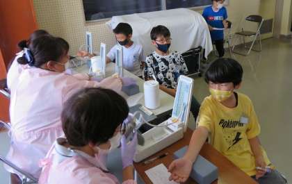 4年生 すこやか検診 公開日 2021/06/17 更新日 2021/06/17 第4学年 すこやか検診がありました。4年生時の体の様子について、腹囲測定・血圧測定・採血による血液検査がありました。子供たちは、学校の発育測定とは違い、医療器具を見ると、少し顔が強ばっていました。無事に採血が終わると、ほっとした表情を見せていました。これからも食事・運動・学習とバランスよく活動していきます。