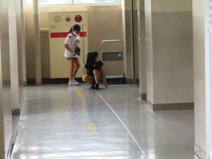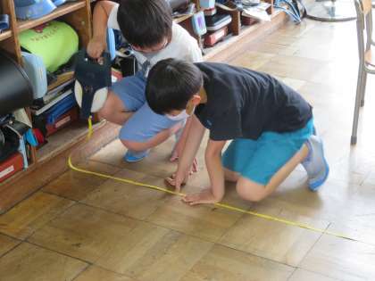 3年生「まきじゃくではかろう!」 公開日 2021/06/22 更新日 2021/06/22 第3学年 算数科の学習で、長い長さをはかって表す学習をしています。今日は、まきじゃくを使って教室のたてと横の長さや、黒板、廊下等の長さをはかりました。班のみんなで協力しながら、意欲的に取り組むことができました。