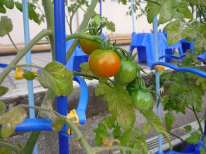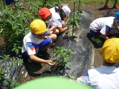 ミニトマトが赤く色付き始めました。子供たちは「赤くなってきた!」と大喜びしています。