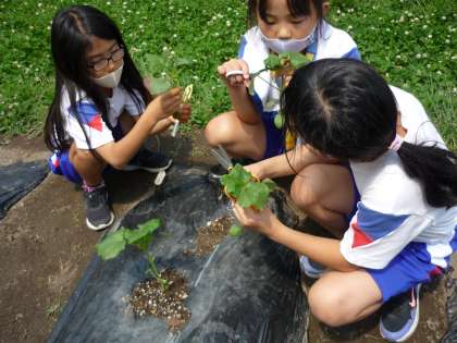 また、畑のオクラも大きく生長し、今日は間引きをしました。大きな実がなることを楽しみに、今後の世話もがんばってほしいと思います。