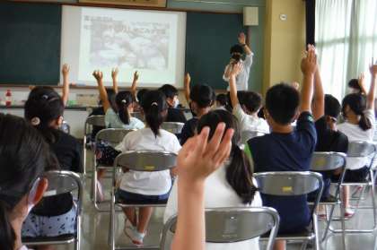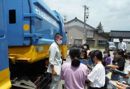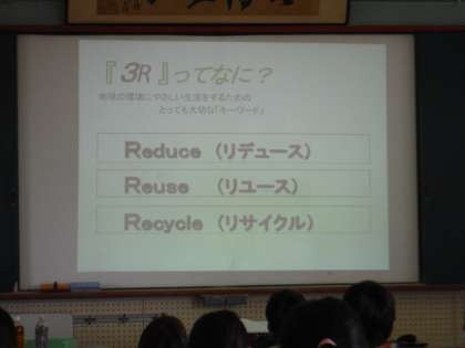 3R推進スクールが行われました。3R(リデュース・リユース・リサイクル)について、詳しく教えていただいた後に、リサイクルで作られた物を見せていただきました。子供たちは、普段ごみとして捨てていた物の中に、リサイクルできる物があることが分かりとても驚いていました。最後に、外に出て、パッカー車のごみを集める仕組みについて、説明をしていただきました。間近で見ることが少ないパッカー車に興味津々の子供たちは、環境センターの職員の皆さんに、たくさんの質問をして、満足気な表情でした。ぜひ、この社会科の学習を通して、ごみについて考えていきたいと思います。