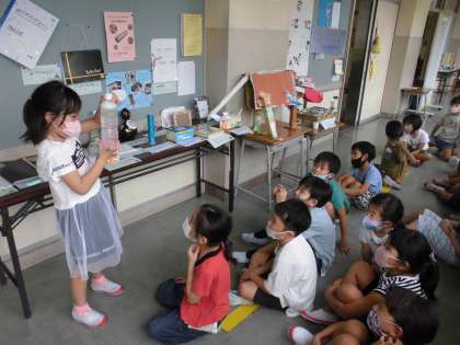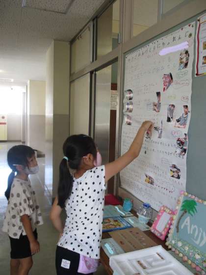 夏休みの作品を廊下に展示しています。頑張って作ったところをクラスのみんなに紹介したり、友達の発表を聞いて質問したりしました。廊下に展示しているので、休み時間に見て楽しんでいます。