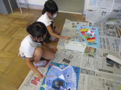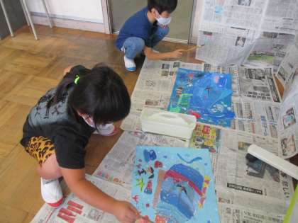 1年生 お魚にのって、海を楽しもう(図画工作科) 公開日 2021/09/09 更新日 2021/09/09 第1学年 図工の作品の仕上げをしました。筆に白い絵の具を付けて振り、海の中の泡や水の感じを上手に表現しました。楽しくてすてきな作品になりました。