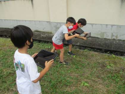 初めてクロムブックを屋外に持ち出し、写真を撮る2年生。最初は緊張しているようでしたが、虫を見つけるとクロムブックを向けて、しっかりと写真に収めていました。熱心にそして、楽しそうに取り組んでいました。