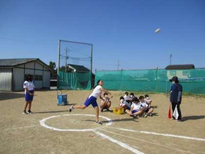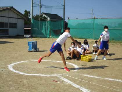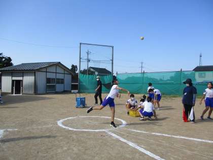 校内チャレンジ陸上記録会、ソフトボール投げの様子です。