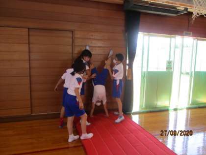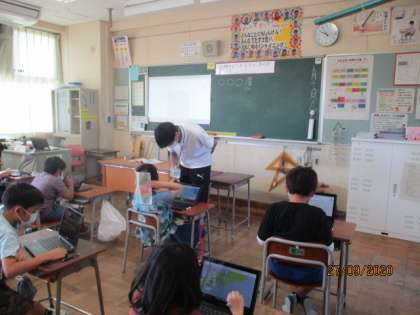 5年生はどちらのクラスも、算数科の公約数の学習でした。公約数を早く見つける方法を考え、真剣に問題に取り組んでいました。3年生のクラスでは、社会科のスーパーマーケットの学習で、クロムブックを使って品物の産地を調べる活動に取り組んでいました。クロムブックに文字を入力する際はローマ字で入力します。ローマ字は3年生で学習するのですが、日頃からクロムブックを使う機会の多い子供たちは、3年生でも素速くローマ字入力ができています。体育館では、4年生が、1、2組の合同体育で、マット運動に取り組んでいました。色団の中で助け合って壁倒立に挑戦していました。4年生は、学習発表会で体育科の発表を予定しています。このマット運動も披露されるのでしょうか。楽しみです。