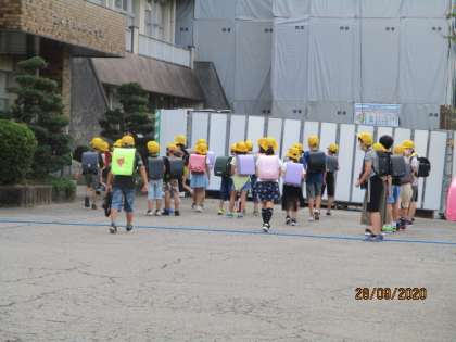 子供たちは登校すると、写真のように学年ごとに列をつくって待ち、学年ごとに一人ずつ玄関に入っていきます。これは、玄関での密を避けるためと、工事で細くなった通路でのけがを防ぐためです。しっかり約束を守る月岡っ子です。