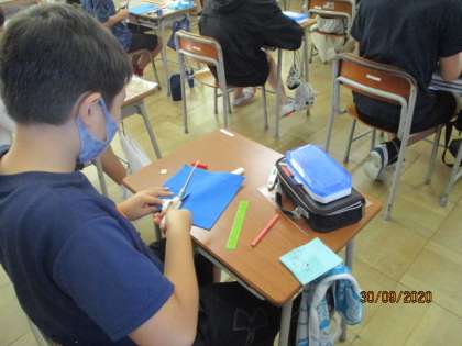 5年生は、家庭科でミニバックづくりに取り組んでいました。フェルト生地に自分で型を取るところからスタートです。細かな作業にもみんな集中して取り組んでいました。
