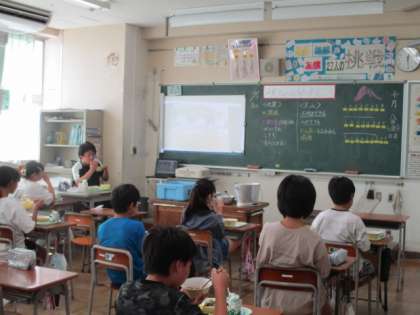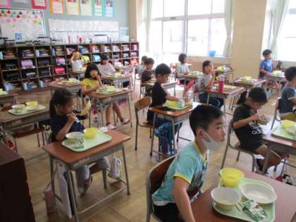 給食時間の2年生教室です。校内放送のBGMが流れる中、みんな静かに食べ、食べ終えると静かに片付け、歯磨きをしています。6年生は、この「默食」の給食時間を利用して、学習発表会の練習を撮影したビデオを視聴していました。自分たちで、演技の改善点を見いだし練習に生かして、6年間の集大成となる発表を、みんなで力を合わせてつくり上げていってくれることと思います。