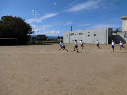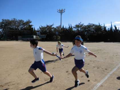 5年生 バトンパス! 公開日 2021/10/19 更新日 2021/10/19 第5学年 体育「リレー」の学習の様子です。 自分たちのチームの「伸び」を大切にして、前回のタイムより縮めることを目標にして練習を重ねてきました。今日は、5回目の最後の計測でした。4チーム中3チームが前回のタイムよりも速くなりました。そして、どのチームも1回目の計測よりもとても速くなりました。 アドバイスをしながら、協力してがんばる姿が素敵でした。