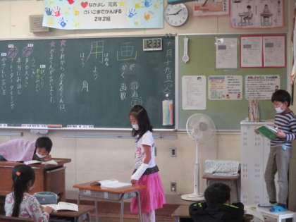 写真は、昨日の2年生の国語科、物語「お手紙」の学習の様子です。主人公の「かえるくん」「がまくん」、ナレーションの3つの役割を代わる代わる演じながら、音読の学習をしていました。どの子供もとても上手で、見ている子供たちからも賞賛の声が上がっていました。