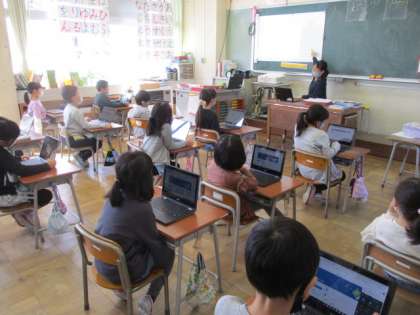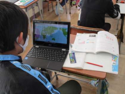 5年生教室では、どちらのクラスもクロムブックを使って学習していました。1組は、校外学習の事前学習で、「イタイイタイ病」について調べていました。2組は、「算数で読みとこう」という課題で、グラフから読み取る学習でした。日本を訪れる外国人旅行者のグラフの読み取りです。中国や韓国など近隣国からの旅行者が多いと読み取った子供たち。では「タイ」は近隣なのか…。そこでクロムブックを使って「タイ」の位置を調べ確認していました。