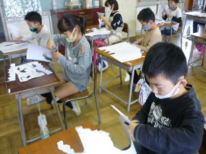 図画工作科「はさみのアート」では、白い画用紙を切り、切ったものを黒画用紙に貼って作品を作りました。はさみをすいすいと思いのままに動かして切った形から、見えたものを想像して、黒画用紙の上に想像の世界を作り出していきました。「これは、鳥で、そして、ここに−−」と楽しそうに説明していました。次の時間は、友達の作品を鑑賞します。友達の作品からどのようなものを想像するのか、楽しみです。