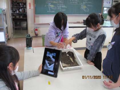 5年生は、「流れる水のはたらき」の学習で、泥でつくった斜面を水が流れる様子を観察していました。何度も見て確かめられるよう、クロムブックで様子を撮影していました。班で協力して実験に取り組んでいました。