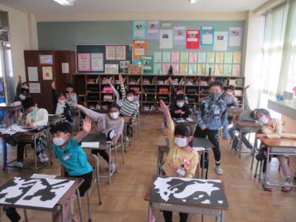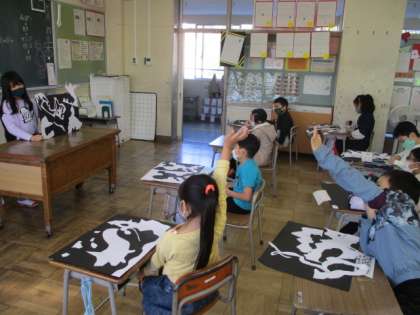 2年生 何が隠れているかな・・・? 公開日 2021/11/04 更新日 2021/11/04 第2学年 図画工作科の学習で、「はさみのあーと」に挑戦しました。 今日は、友達の作品を見て、何に見えるか当てっこをしました。 「僕は、釣りをしている人のつもりだったけど、友達は違うものに見えていたみたい!」と、楽しく鑑賞しました。