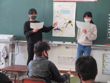 6年生の外国語の学習では、選んだ動物について食べ物を調べ、食物連鎖としてまとめたことを英語で発表する活動に取り組んでいました。英語の表現にも大分慣れている様子です。