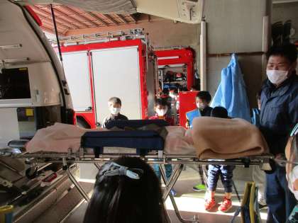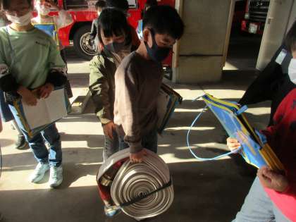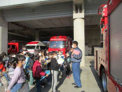 3年生:校外学習−消防署1組− 公開日 2021/11/19 更新日 2021/11/19 第3学年 午後からは、消防署に見学に行きました。いろいろな種類の車両を見たり、実際に使われているホースを持ってみる体験をしたりしました。 また、疑問に思っていることを質問し、たくさんのことを学ぶことができました。今日、学んだことをこれからの社会科の学習に生かしてきたいと思います。