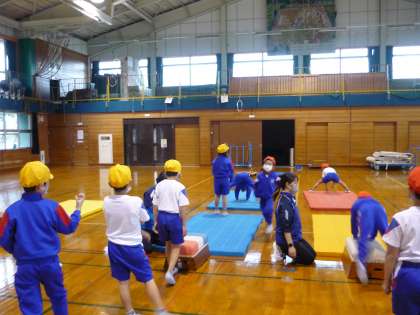 ロイター版の踏切の仕方や手の付き方等を段階的に教えていただき、3段の跳び箱を跳べるようになった子もいました。「楽しかったよ」、「もっと高い跳び箱も跳びたい!」と元気な声が聞こえました。