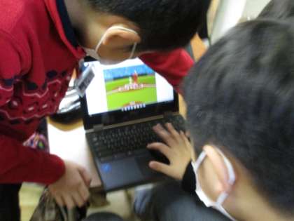 総合的な学習の時間にプログラミングの学習を行っています。それぞれが考えて作成したゲームを紹介し合う「月岡myゲームshow」を行いました。みんな友達のつくったゲームで楽しく遊びながら、「次はもっとおもしろいゲームをつくりたい」などと意欲を高めていました。
