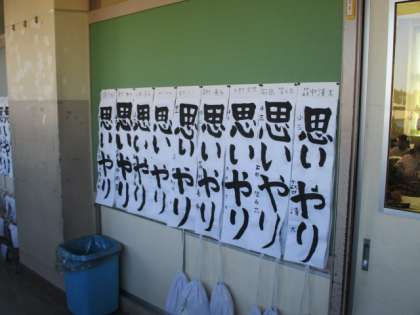 廊下には、3学期始業式後に行う書き初め大会に向け、練習した書き初めを掲示している学級も多くあります。練習の回数を重ねるごとに上達している様子がうかがわれます。