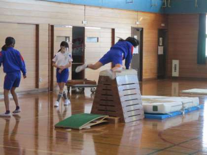 体育館では、寒さに負けず、6年生が跳び箱運動に取り組んでいました。さすが6年生。8段の跳び箱も豪快に跳び越していました。
