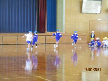 体育館では、この寒さに負けず、1年生が元気にかけっこをしていました。わざセブンの金賞を目指し、どの子供の力を振り絞って走っていました。