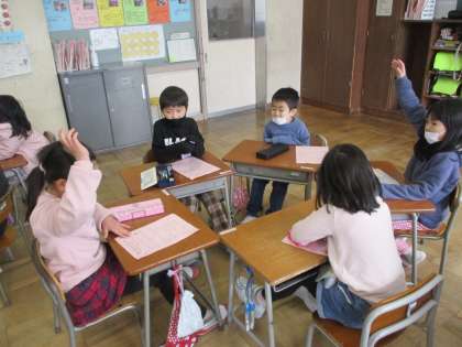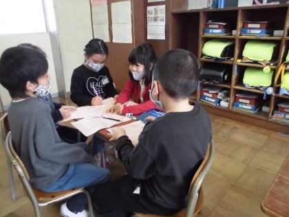雪っ子遠足に向けて各班で集まり、班の目当てや雪像作りで何を作るのかを決めました。雪像作りで何を作るのか、楽しんで相談していました。雪っ子遠足は、来週です。安全に気をつけて、行ってきたいと思います。