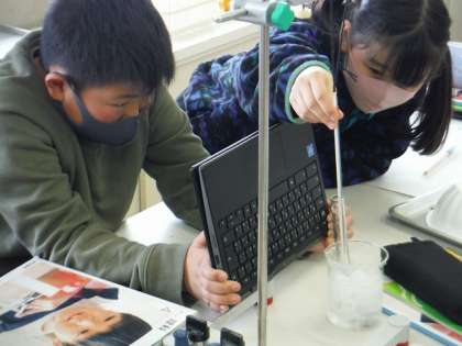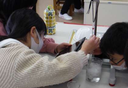 理科の学習では水の温度と様子について実験をしています。2学期の学習で、水は冷やすと体積が小さくなることを知っていた子供たちは、もっともっと体積が小さくなると予想していました。温度計の目盛りと水の様子を集中して観察している子供たちでしたが、1分ごとに計測していたとちゅうで、水が氷になっている様子が分かると、驚きの声をあげていました。大寒の日にもっと冷えろと熱く実験をする子供たちでした。